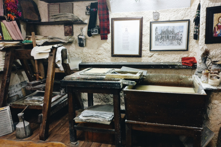 Also machten wir uns am nächsten Morgen auf. Unser erstes Ziel war ein kleiner Laden in dem selbstgeschöpftes Papier verkauft wurde. Dabei zeigte einem der Besitzer wie das Papier gemacht wurde und presste mit einer Gutenberg Presse noch ein wunderschönes Bild auf ein bereits getrocknetes Blatt. Wenn man wollte konnte man einige der Drucke oder selbstgebundene Notizbücher erwerben. Es war wirklich einfach nur schön.